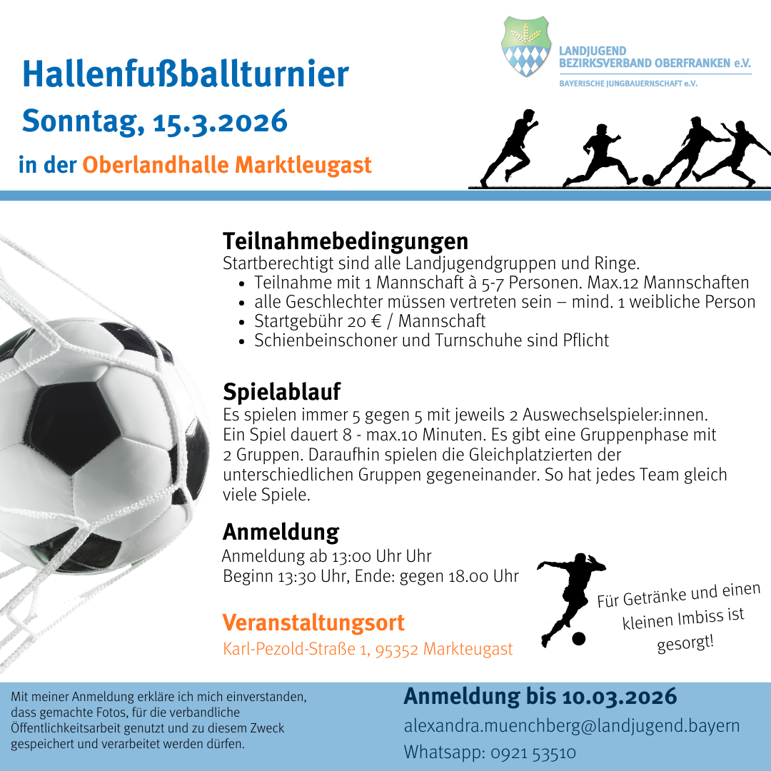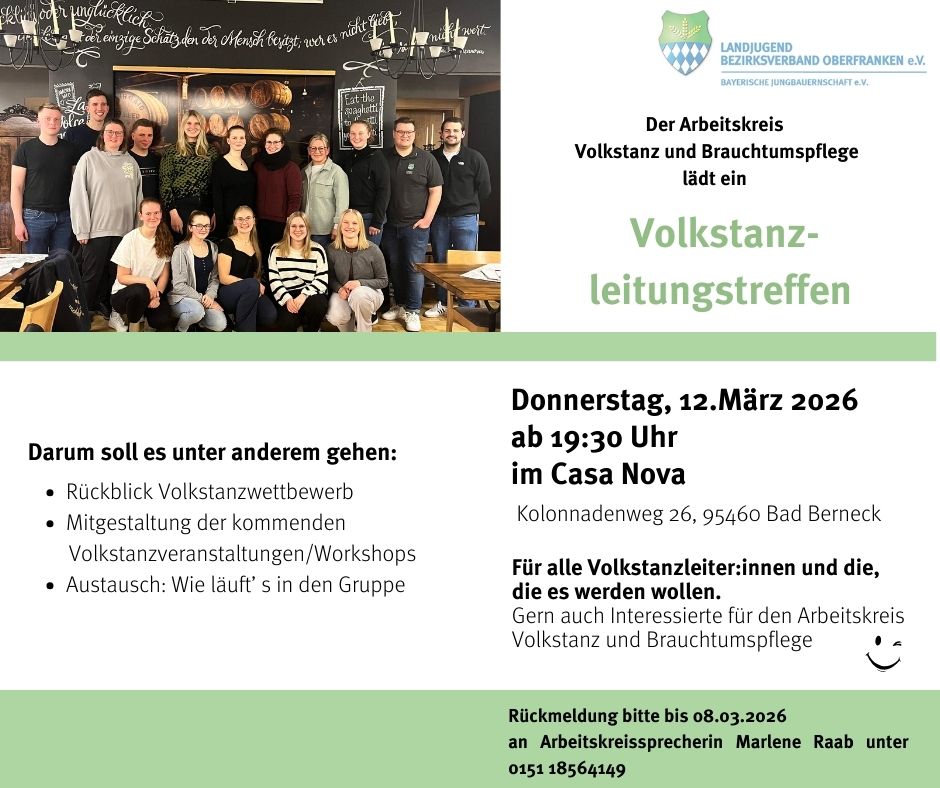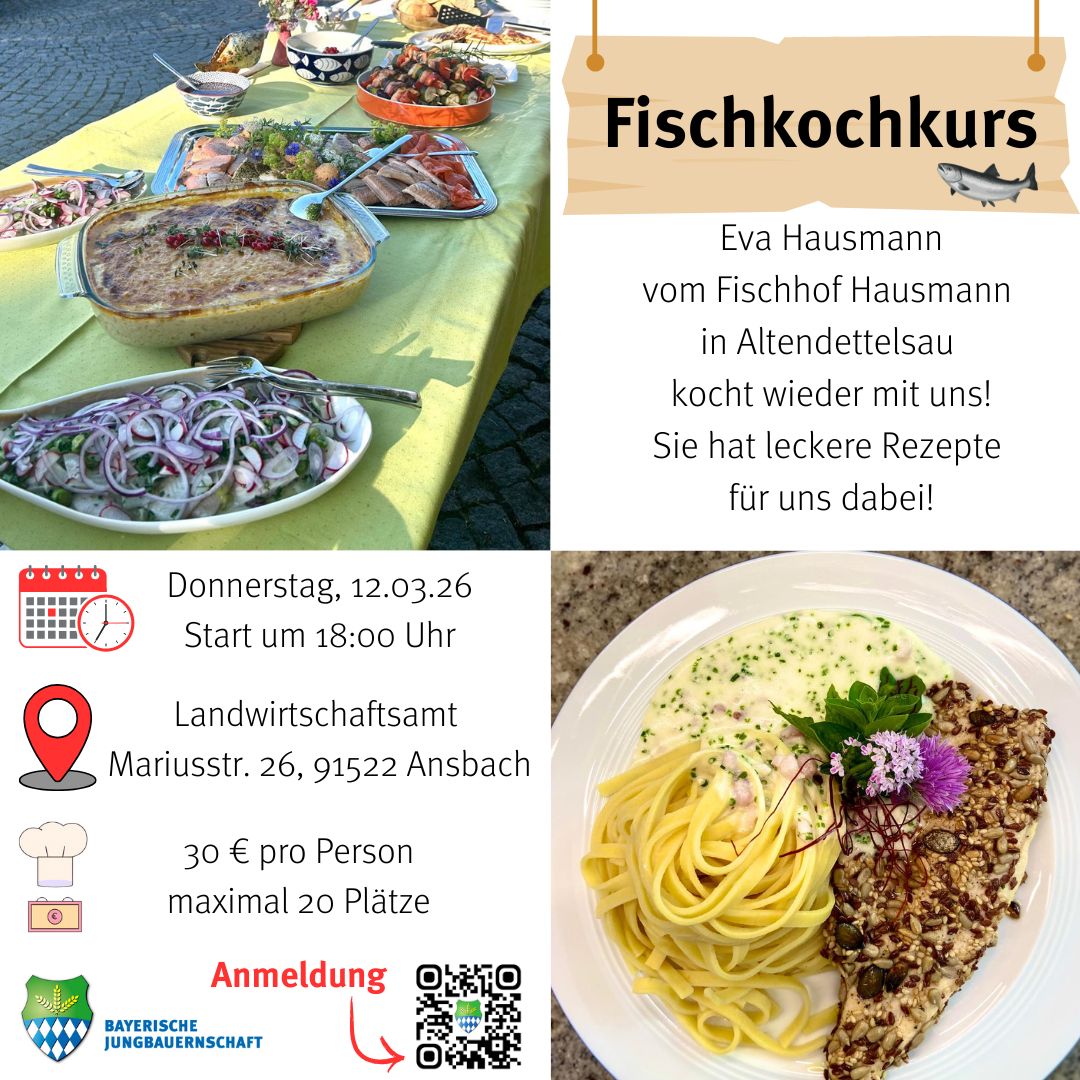 Die Bayerische Jungbauernschaft - Bezirksverband Mittelfranken e. V. freut sich auf dich! Im Landwirtschaftsamt Ansbach (Mariusstr. 26, 91522 Ansbach) bereiten wir mit Eva Hausmann (Fischhof Hausmann, Altendettelsau) am Donnerstag, 12.03.2026 ab 18:00 Uhr leckere Fischgerichte zu. 30 € Kostenbeitrag, max. 20 Personen Anmeldung? Hier!